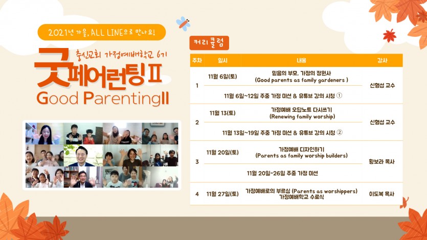강사: 신형섭 교수(장신대 기독교교육), 이도복 목사(충신교회 교육총괄), 황보라 목사(굿페어런팅 담당)